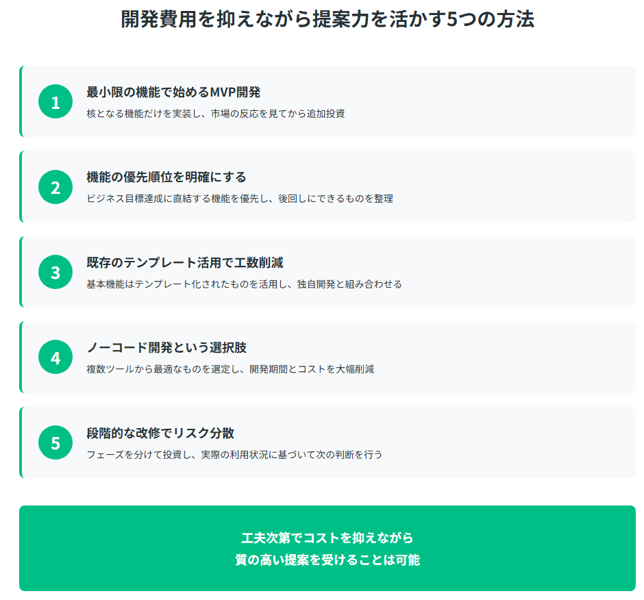 提案力のある開発会社に依頼したいけれど、予算には限りがあるという企業は多いもの。しかし、工夫次第で費用を抑えながらも、質の高い提案を受けることは可能です。ここでは、コストを最適化しながらアプリ開発を進めるための5つの方法をご紹介します。