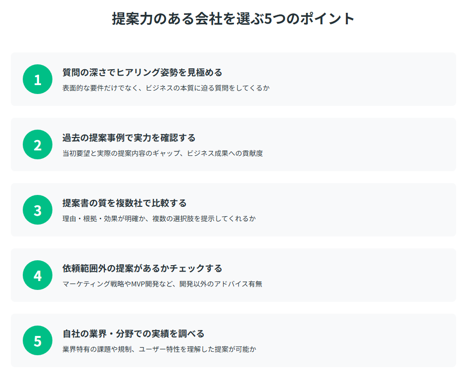 アプリ開発を成功させるには、技術力だけでなく提案力のある会社を選ぶことが重要です。しかし、提案力の有無は実際に話を聞いてみないと分かりにくいもの。ここでは、提案力のある開発会社を見極めるための5つのチェックポイントをご紹介します。