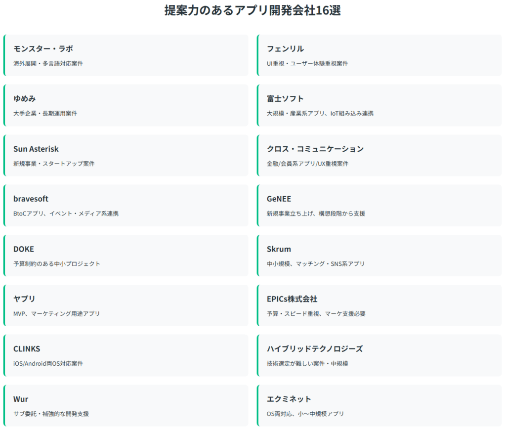 大規模なグローバル展開を目指すならモンスター・ラボやゆめみ、UI/UXにこだわるならフェンリルやクロス・コミュニケーション。新規事業の立ち上げにはSun AsteriskやGeNEE、コストを抑えたいならDOKEやSkrum、ヤプリが候補となります。技術的な柔軟性を求めるなら、CLINKSやハイブリッドテクノロジーズも検討に値するでしょう。