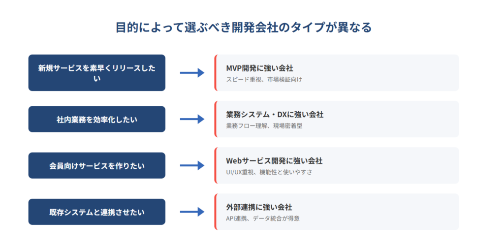 自社の目的と開発会社の強みがマッチしているかを確認することが大切です。                          MVP開発(最小限の機能で素早くリリースし、市場の反応を見る開発手法)を希望するなら、スピード重視の会社を選ぶべきでしょう。一方、複雑な業務フローをシステム化したい場合は、要件整理から丁寧に対応してくれる会社が向いています。