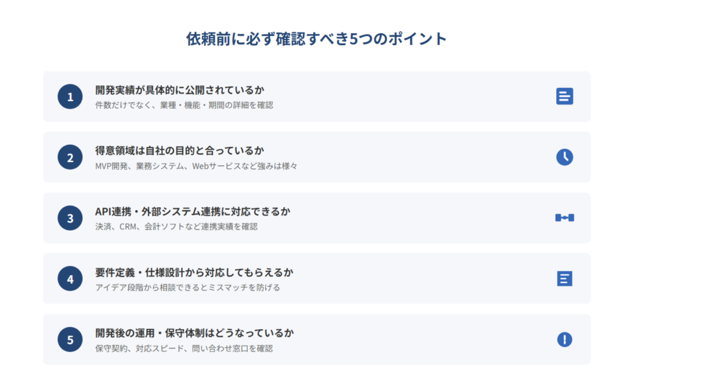 開発実績の具体性、得意領域、API連携の対応可否、要件定義のサポート有無、開発後の運用体制の5点を確認しましょう。自社が作りたいサービスと似た実績がある会社を選ぶと、開発がスムーズに進みやすくなります。