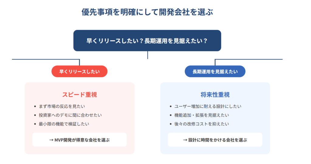 開発において、スピードと将来性はトレードオフの関係になることがあります。                                        どちらを優先するかによって、開発の進め方や会社選びが変わってきます。