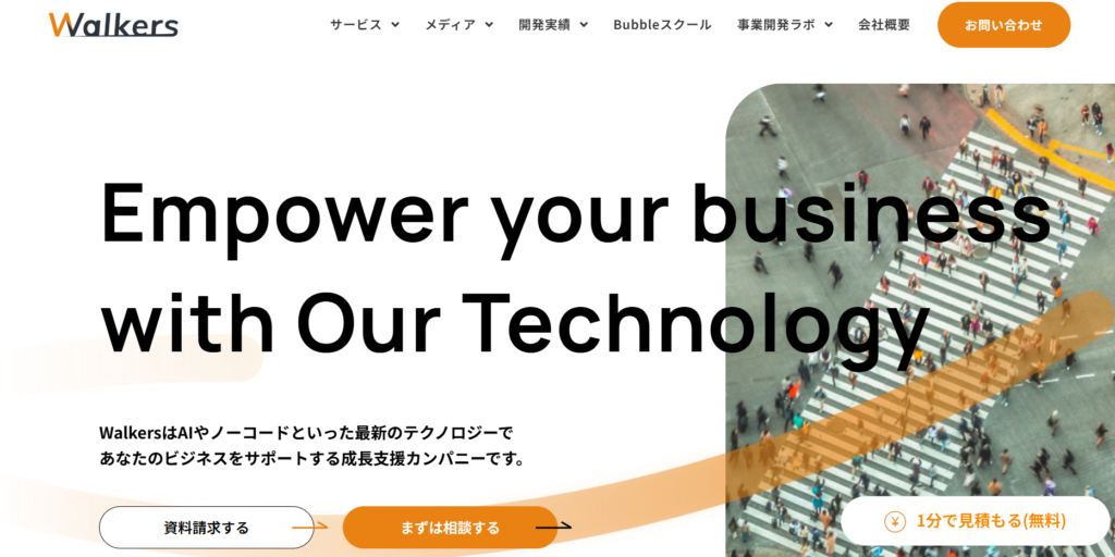 株式会社Walkersは、累計300件以上の開発実績を持つノーコード開発のリーディングカンパニーです。Bubble開発に加え、補助金制度の活用支援にも力を入れており、開発コストを平均80%以上削減できた事例もあります。