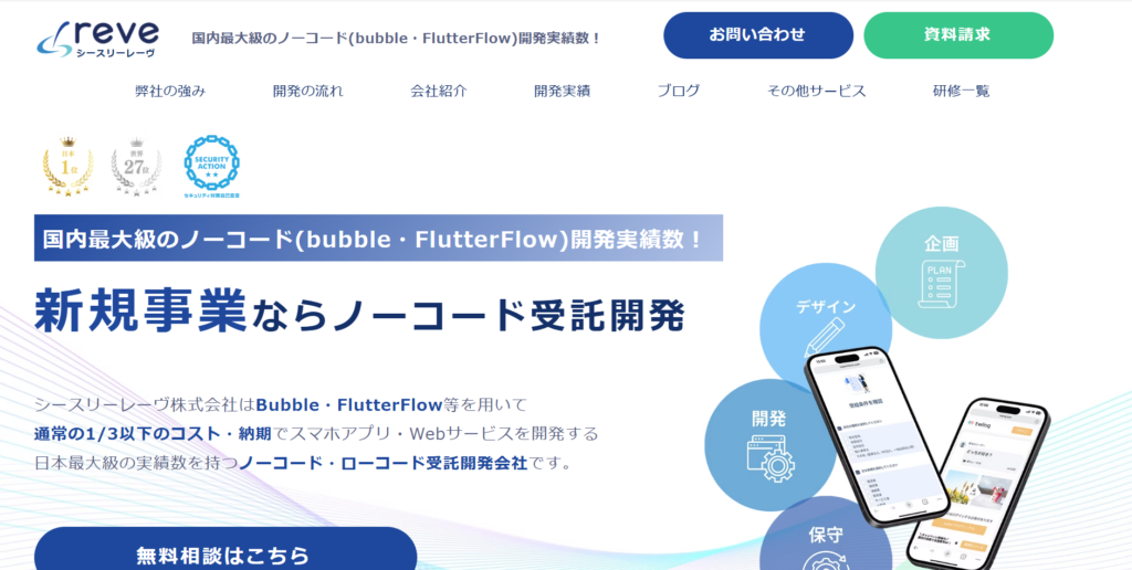 シースリーレーヴ株式会社は、Bubbleの開発実績数が国内トップクラスを誇る開発会社です。                       AIを活用したサービスやマッチングプラットフォーム、補助金の自動診断サービスなど、幅広いジャンルの開発実績があります。