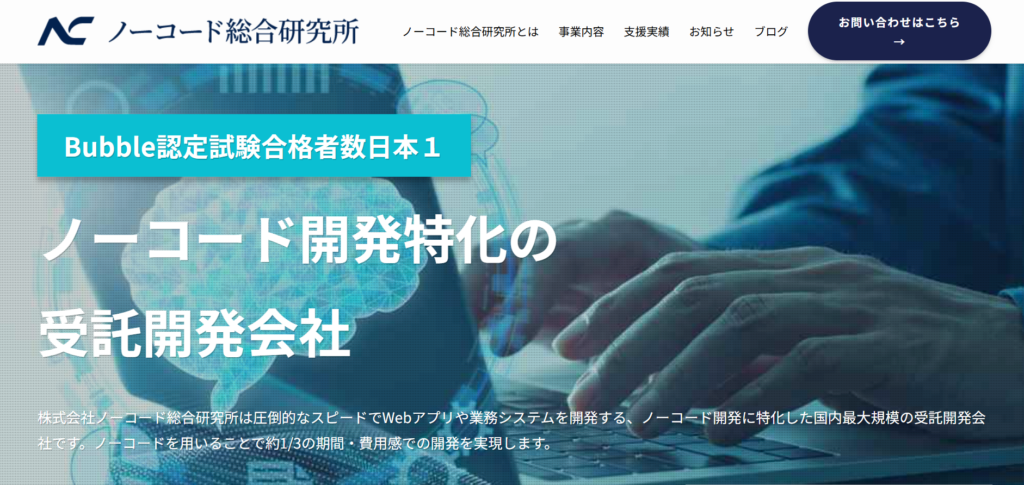 株式会社ノーコード総合研究所は、Bubbleの公式認定試験に合格したエンジニアの数が国内最多を誇る会社です。食事管理アプリやジム検索アプリ、マッチングアプリなど、多様なサービスを開発してきた実績があります。