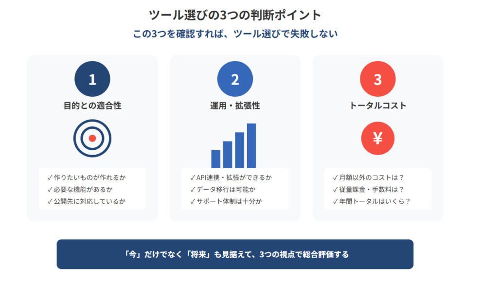 ここでは、ツール選びで失敗しないために押さえておきたい3つの判断ポイントを解説します。