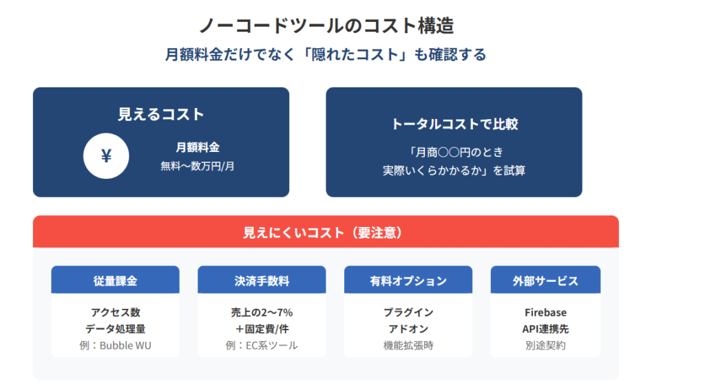 ノーコードツールを検討する際、つい月額料金だけに目が行きがちですが、実際の運用では「隠れたコスト」が発生することも少なくありません。