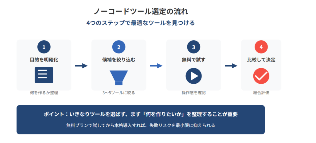 ここまで、ノーコードツールの種類や判断ポイントを解説してきました。では、実際にどのような手順でツールを選べばよいのでしょうか。