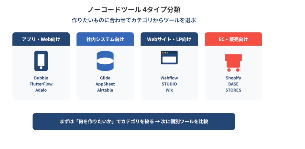 ノーコードツールは数多く存在しますが、すべてが同じ用途に向いているわけではありません。大きく分けると、アプリ開発向け、社内システム向け、Webサイト制作向け、EC構築向けの4タイプに分類できます。