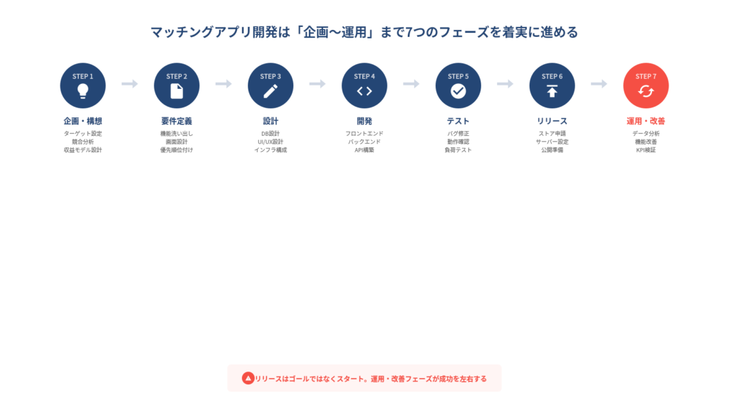 設計段階でこれらをしっかり固めておくことで、開発中の迷いや手戻りを大幅に減らすことができます。「作る前にどれだけ考え抜けるか」が、マッチングアプリ開発の成否を分ける最大のポイントです。