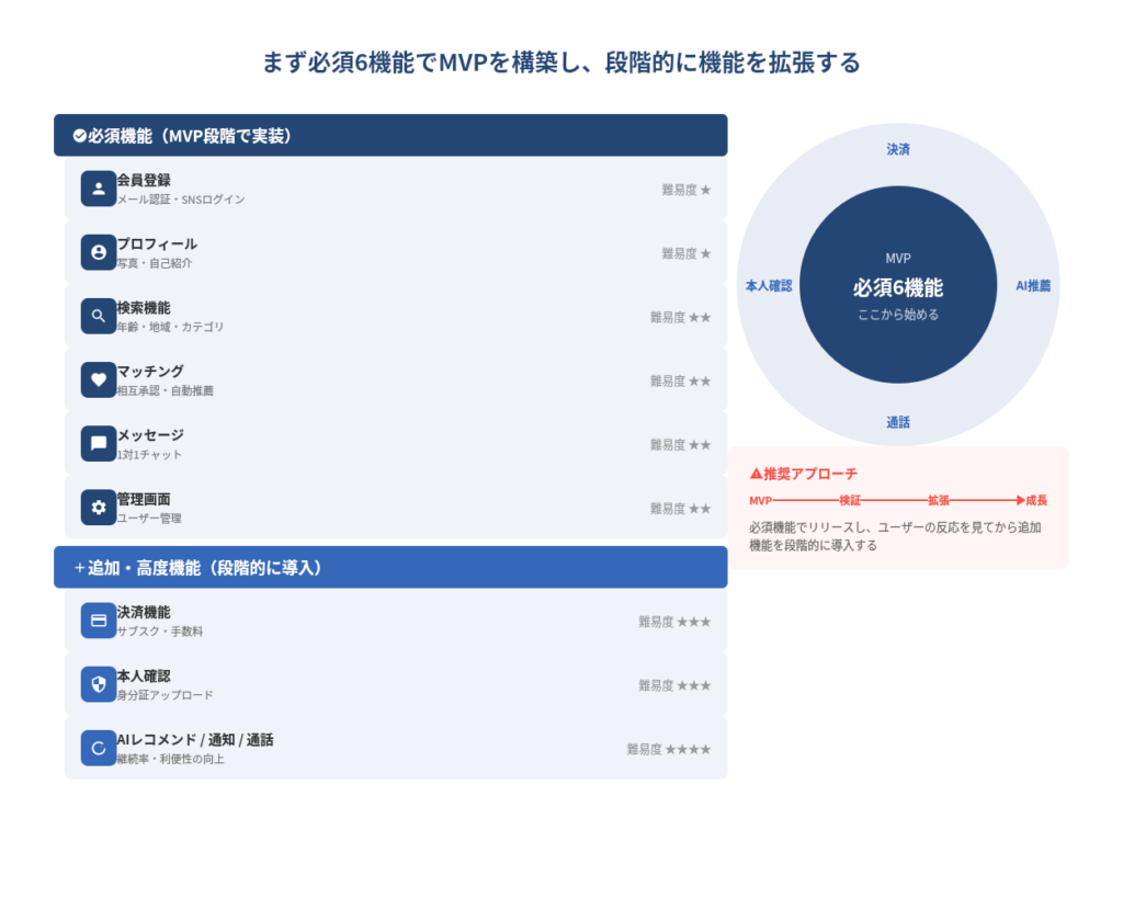 会員登録、プロフィール、検索・フィルタリング、マッチングロジック、メッセージ、管理画面の6つが必須です。決済やAIレコメンド、ビデオ通話などは、ユーザーの反応を見ながら段階的に追加するのが効率的な進め方です。