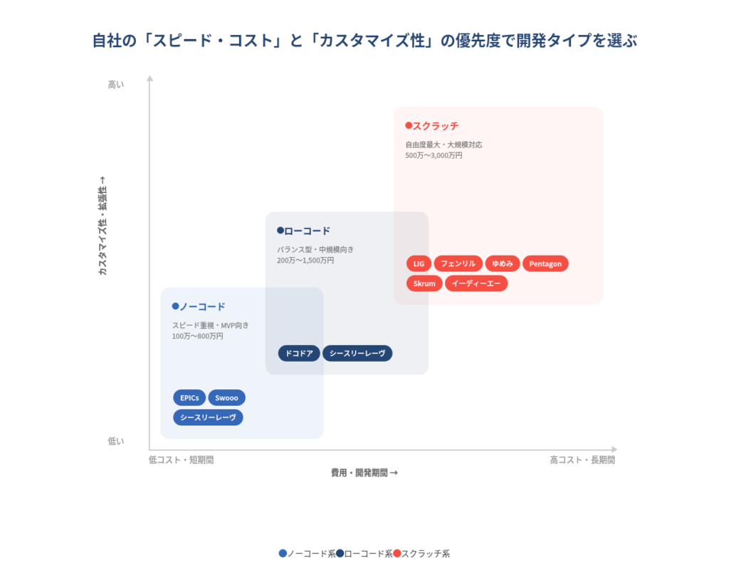 開発会社は大きく「ノーコード・ローコード系」と「スクラッチ開発系」の2タイプに分かれます。前章でお伝えした選び方のポイントを踏まえつつ、自社のプロジェクトに合ったパートナーを見つける参考にしてください。