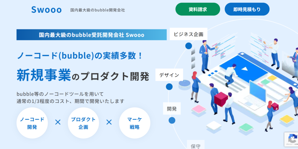 Swoooは、Bubbleを中心としたノーコード開発に強みを持つ開発会社。MVP開発に力を入れており、「まずは最小限のプロダクトでビジネスの仮説を検証したい」というスタートアップや新規事業向けのプロジェクトとの相性が良いのが特徴です。