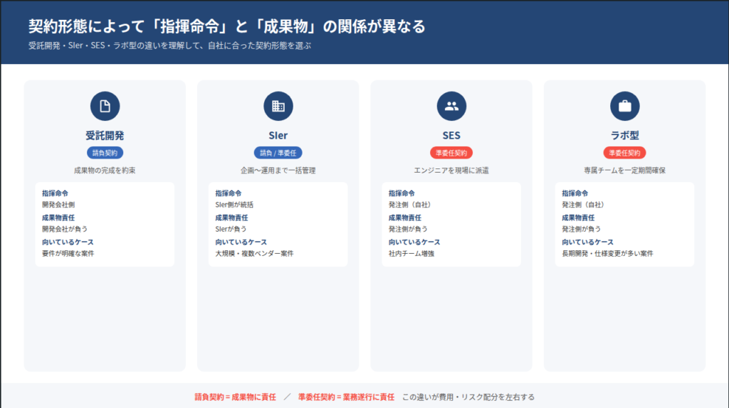 システム開発の依頼形態にはいくつかの種類があり、それぞれ役割や契約のしくみが異なります。よく耳にする4つの形態を以下の表で比較してみましょう。