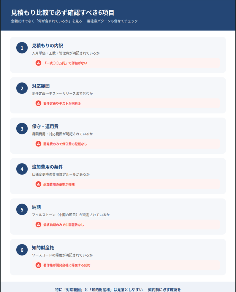 | 見積もりの内訳 | 人月単価・工数・管理費が明記されているか | 「一式○○万円」で詳細がない |
