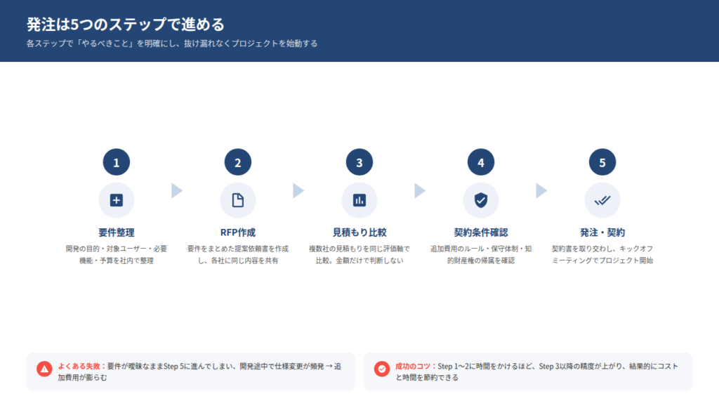 費用相場や会社の選び方を理解したら、いよいよ実際の発注フェーズに入ります。しかし、ここで準備や確認が不足していると、開発の途中でトラブルが発生し、追加コストや納期遅延につながることも少なくありません。