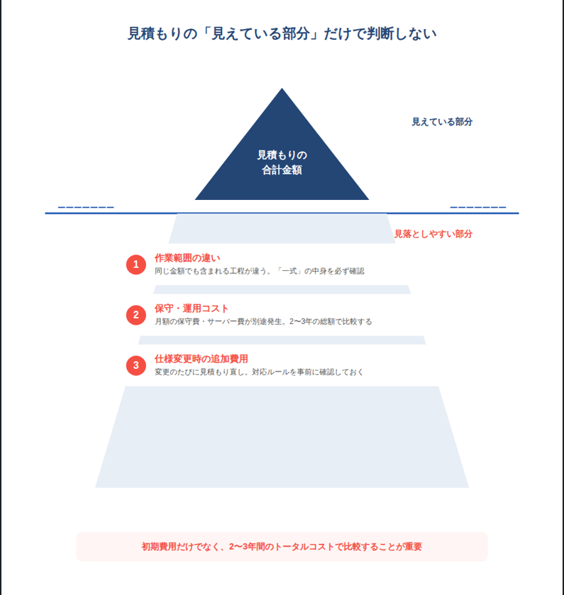 ここまで見てきたように、見積もり金額だけで開発会社を選ぶのは非常にリスクが高い判断です。金額が安い会社には安い理由があり、その理由が「効率的な開発手法を使っている」であれば問題ありませんが、「テスト工程を省いている」「保守に対応していない」であれば、結果的にコスト増や品質低下を招きかねません。