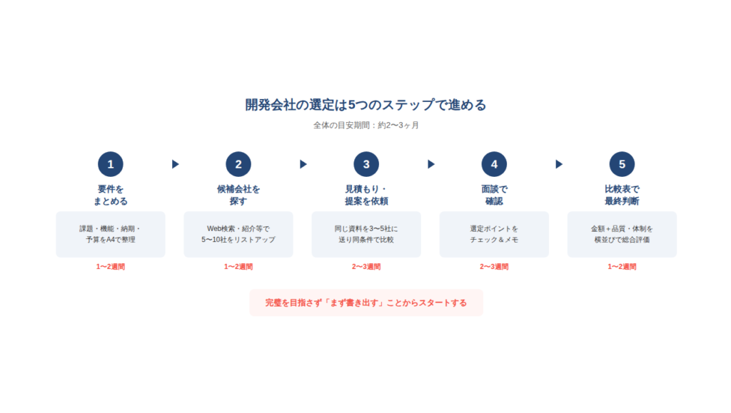 以下の5つのステップに沿って進めれば、初めてシステム開発を外注する方でもスムーズに選定を進められます。全体のスケジュール感としては、おおむね2〜3ヶ月を目安にしてみてください。