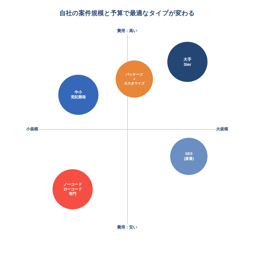 | 中小受託開発 | 小〜中規模 | 中程度 | 中程度 | ◎ | ○ | 担当者との距離が近く、柔軟に相談しやすい | 会社によって品質のばらつきが大きい |