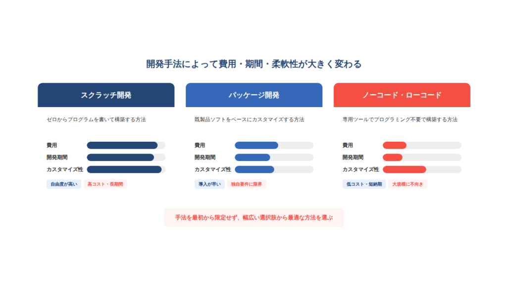 システムの「作り方」にもいくつかの種類があり、どの手法を選ぶかによって費用・期間・柔軟性が大きく変わります。主な開発手法を簡単に整理しておきましょう。