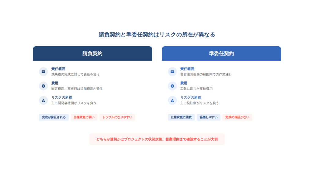 請負契約は一見すると発注側に有利に見えますが、要件が固まりきっていない段階で請負契約を結んでしまうと、仕様変更のたびに追加費用が発生したり、「仕様書に書いていない」といったトラブルに発展しやすくなったりする面もあります。どちらの契約形態が適しているかは、プロジェクトの状況によって異なるため、開発会社がどのような理由でその契約形態を提案しているのかまで確認すると、信頼性を判断する材料になるでしょう。