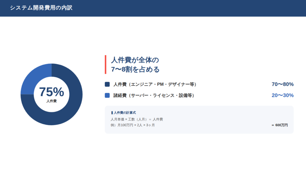 システム開発の費用構造は、シンプルに言うと「人件費(7〜8割)+諸経費(2〜3割)」で成り立っています。つまり、見積もりの大部分は「誰が・どれくらいの時間をかけて作るか」で決まるということです。