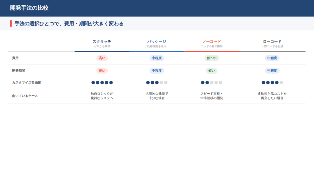 開発手法ごとの費用感は大きく異なるため、「何を実現したいか」を整理したうえで、最適な手法を選ぶことがコスト削減の第一歩です。