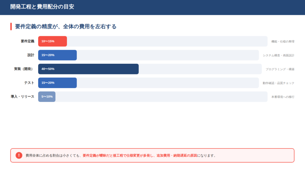 費用の面では実装フェーズが最も大きな割合を占めます。ただし、全体の費用を大きく左右するのは「要件定義」の精度です。