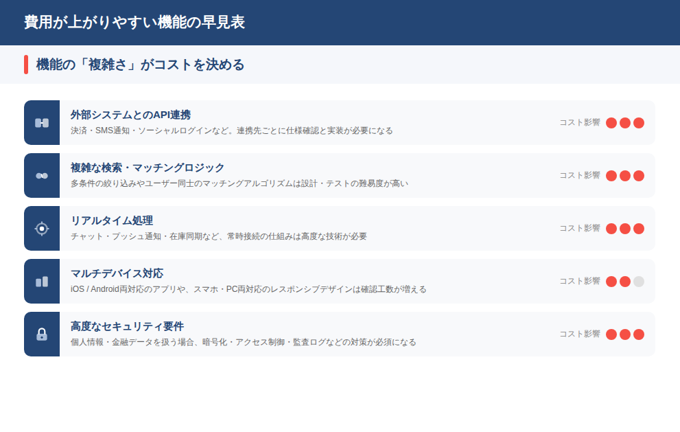 - 複雑な検索・マッチングロジック:条件が多い絞り込み検索や、ユーザー同士をマッチングするアルゴリズムは、設計・テストの難易度が高くなる