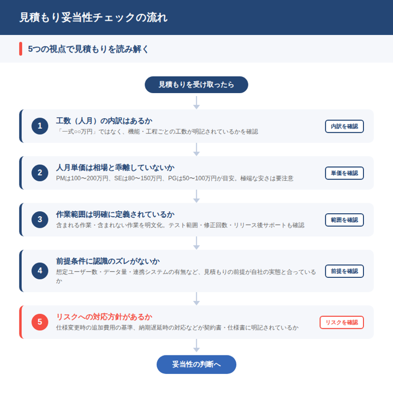 A. 工数の内訳・人月単価・作業範囲・前提条件の4点を確認しましょう。「一式○○万円」のような内訳のない見積もりは、後から追加費用が発生するリスクがあります。