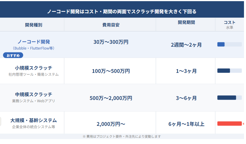 | ノーコード開発 | 業務管理ツール・社内システム・MVP | 30万〜300万円 | 2週間〜2ヶ月 |