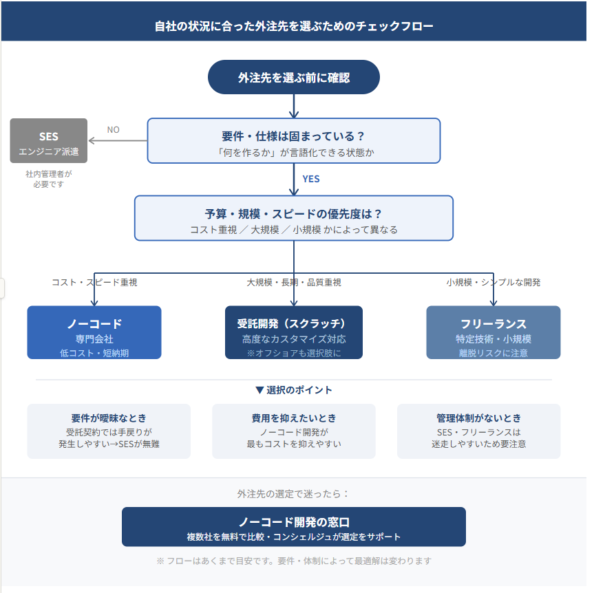 受託開発会社・ノーコード専門会社・SES・オフショア・フリーランスの5種類があります。「要件が固まっているか」「予算・規模・納期」「実績と保守体制」の3軸で絞り込むのが基本です。