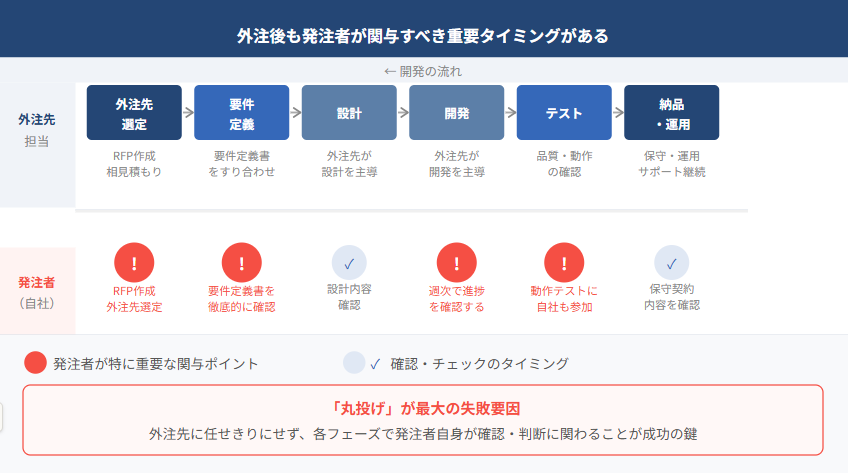 外注契約を結んだあとも、プロジェクトの主体は常に発注者(自社)にあるという意識を持つことが大切です。「専門家に任せているから大丈夫」という姿勢で開発を丸投げしてしまうと、外注先との認識がじわじわとずれていき、完成間際になって初めて問題に気づく——という事態を招きやすくなります。