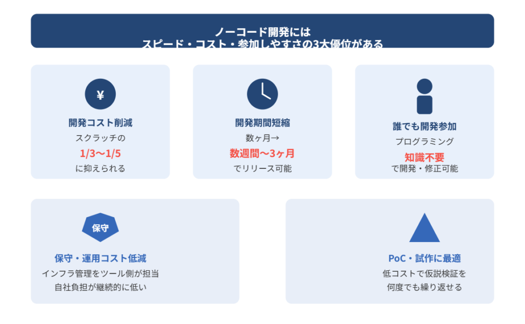 ノーコード開発には、従来のスクラッチ開発(ゼロからコードを書いて作る開発)と比べて、多くの利点があります。主なメリットは以下の5つです。