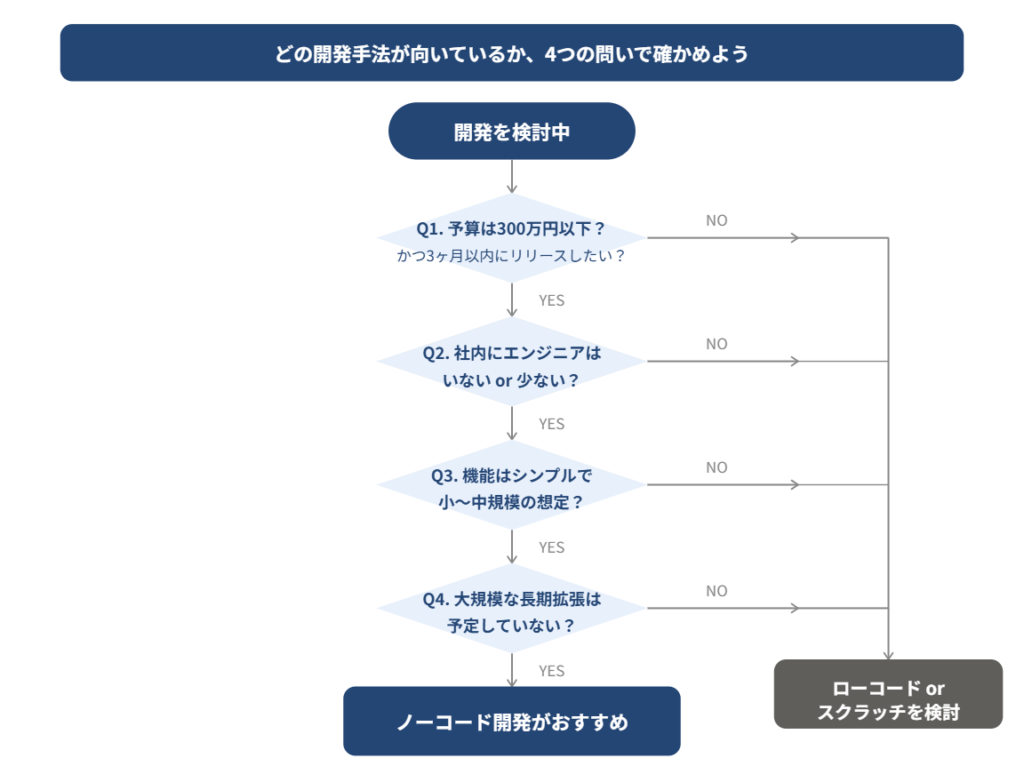 「向いているケース」に当てはまる項目が多いほど、ノーコード開発との相性は良好です。一方、「向いていないケース」が複数重なるようであれば、ローコードやスクラッチ開発への切り替えも視野に入れましょう。