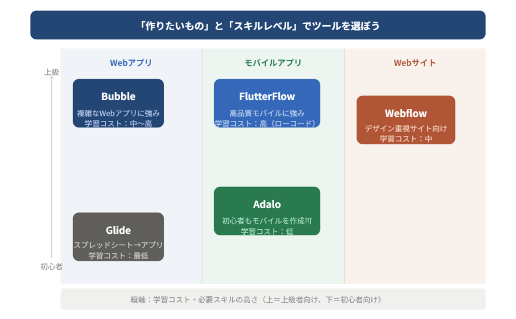 ノーコード開発を始めるにあたって、最初に悩むのが「どのツールを使えばいいか」という問題です。一口にノーコードツールといっても、Webアプリに特化したもの、モバイルアプリに強いもの、Webサイト制作向けのものなど、用途によって得意分野がまったく異なります。